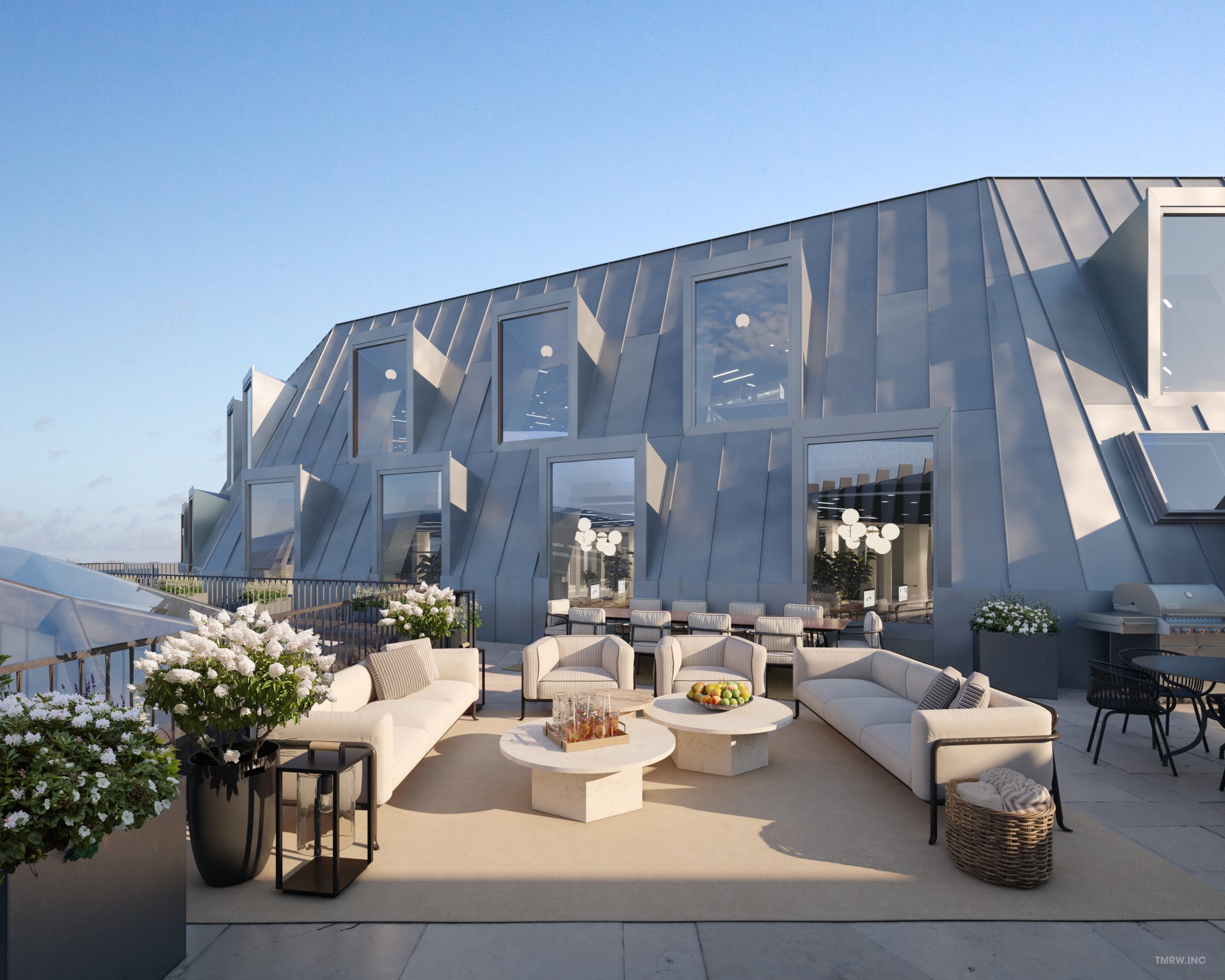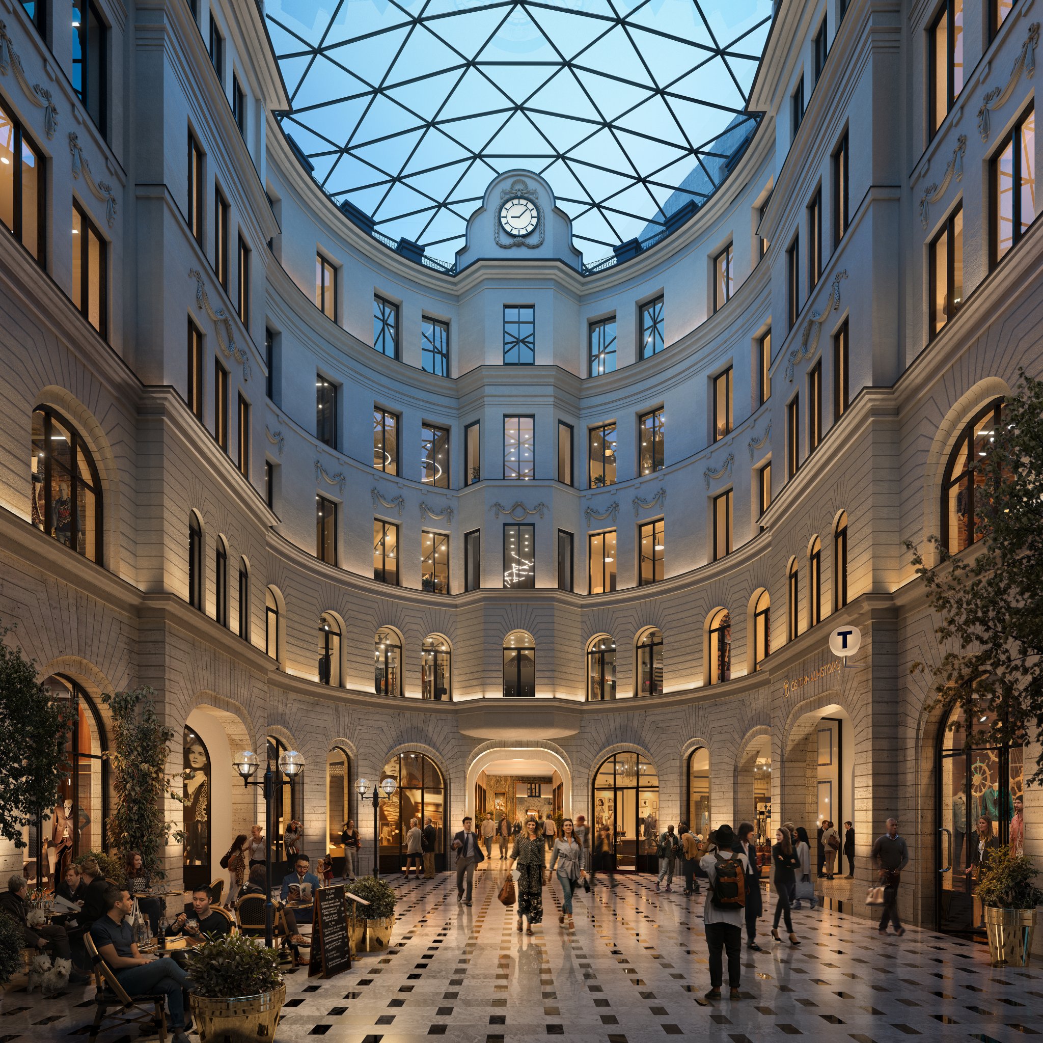 Mittpunkten i kvarteret med en ny tunnelbaneuppgång och en matmarknad en våning ner.